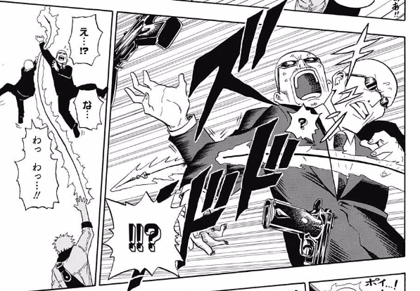 主人公が2ページ後にその屋上から大人を2人を落としてる。描写を見るに2人とも頭から落ちてる。