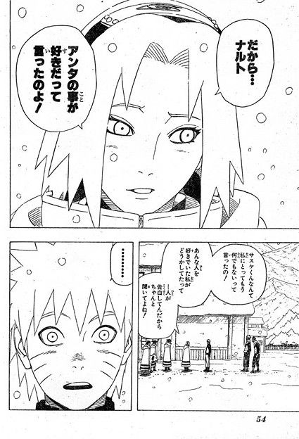 あれって、自分の発言に縛られたナルトを解放してあげようっていうサクラなりの気遣いなんじゃないのか。結局嘘ってナルトが見抜いてるから、良かったねチャンチャン♪じゃないのか・・・。ナルト自身も、そこまでサクラを恋愛対象に見てないって思ってたんだが・・・だって、一部でサクラの強がりとか全く見抜けてないし、サスケの方がその辺見抜いてたと言うか。
