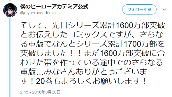 僕のヒーローアカデミア 1~20巻累計(シリーズ) 1700万部