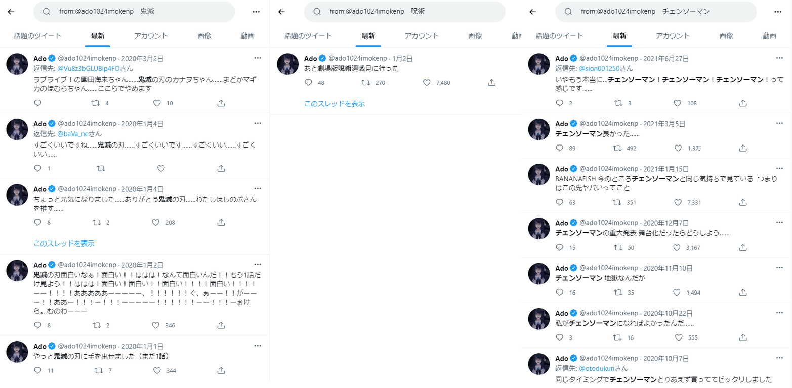 ado「アクタージュ大好き!、鬼滅の刃尊い…、呪術廻戦面白い!チェーンソーマン最高!…ワンピ…?」