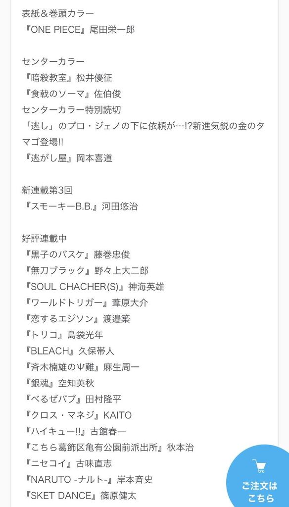 ◆ワンピース ◆食戟のソーマ ◆ニセコイ ◆磯部磯兵衛物語 ◆斉木楠雄のΨ難 ◆銀魂 ◆ハイキュー ◆トリコ ◆ワールドトリガー ◆こち亀 ◆BLEACH ◆火ノ丸相撲 ◆僕のヒーローアカデミア ◆鬼滅の刃 ◆ブラッククローバー ◆背すじをピン!と ◆左門くんはサモナー ◆ゆらぎ荘の幽奈さん ◆たくあんとバツの日常閻魔帳 ◆約束のネバーランド ◆ラブラッシュ! ◆レッドスプライト ◆HUNTER×HUNTER ◆ドラゴンボール ◆ジョジョの奇妙な冒険 ◆ナルト ◆SOUL CATCHER(S) ◆読み切り ◆ジャンプ掲載順 ◆スレッド一覧