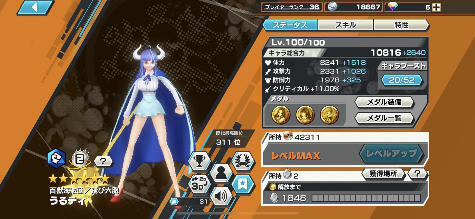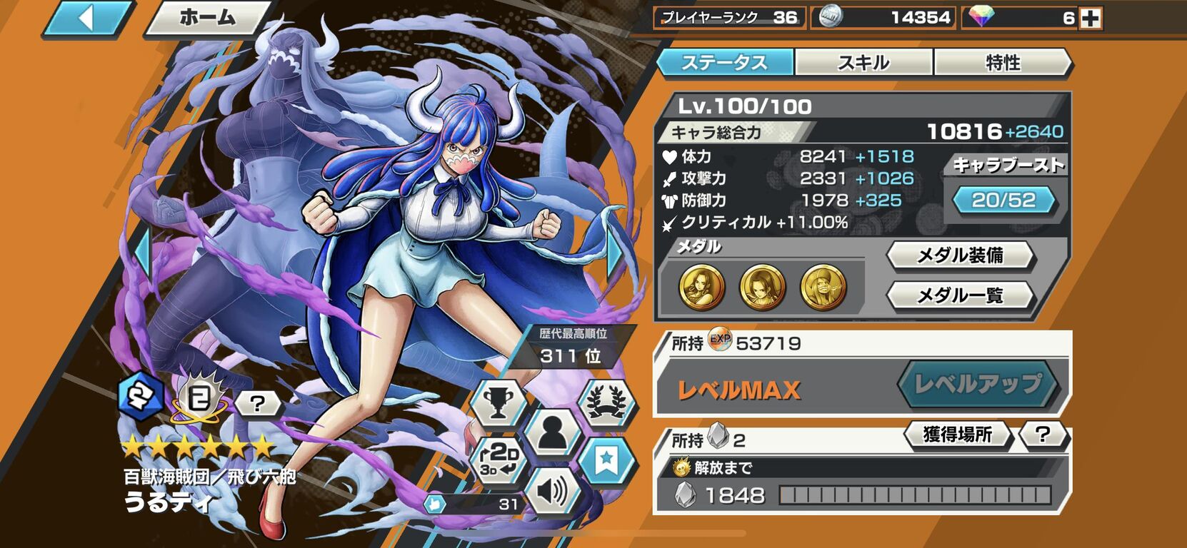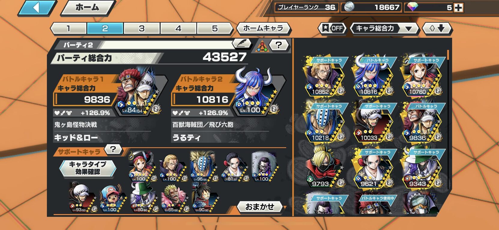 うるティ>ゾロ>シャンクス>ウタ>ヤマト>クラッカー