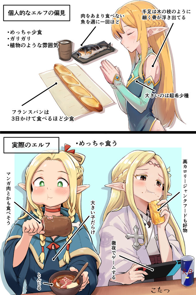 ちなみに例の中でマルシルだけはハーフエルフなんで、イメージでも肉食って当然ではある。