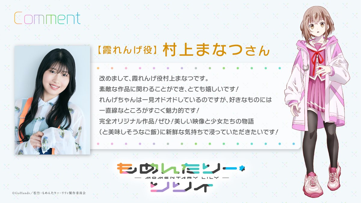 テレビアニメ「好きな子がめがねを忘れた」「K」「ハンドシェイカー」などで知られるアニメ制作スタジオ・GoHandsの完全オリジナルアニメ「もめんたりー・リリィ」のメインキャストが発表された。阿部菜摘子さんが河津ゆり役、桜木つぐみさんが高台寺えりか役、若山詩音さんが薄墨ひなげし役、村上まなつさんが霞れんげ役、久野美咲さんが吉野さざんか役、島袋美由利さんが咲耶あやめ役として出演する。